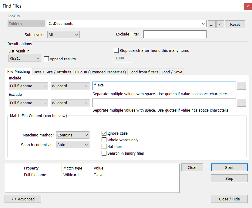 Specify search criteria using wildcards, regex, or by matching file or folder names that contain specific text.